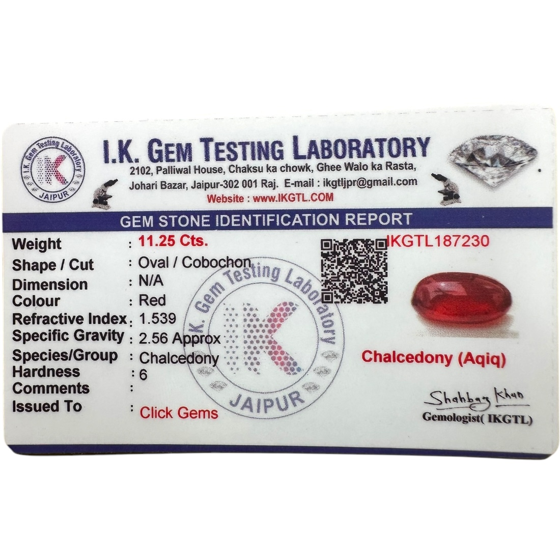This beautiful Red Agate (Aqiq) gemstone, weighing 11.25 carats, features a vibrant red color that exudes warmth and energy. The oval/cabochon shape highlights the smooth, rounded surface of the stone, allowing its rich, translucent red hue to captivate with its natural brilliance. With a hardness of 6 on the Mohs scale, this agate is perfect for creating durable and long-lasting jewelry. Known for its grounding and protective properties, Red Agate is believed to bring strength, courage, and emotional healing, making it an excellent choice for powerful and meaningful jewelry designs.
