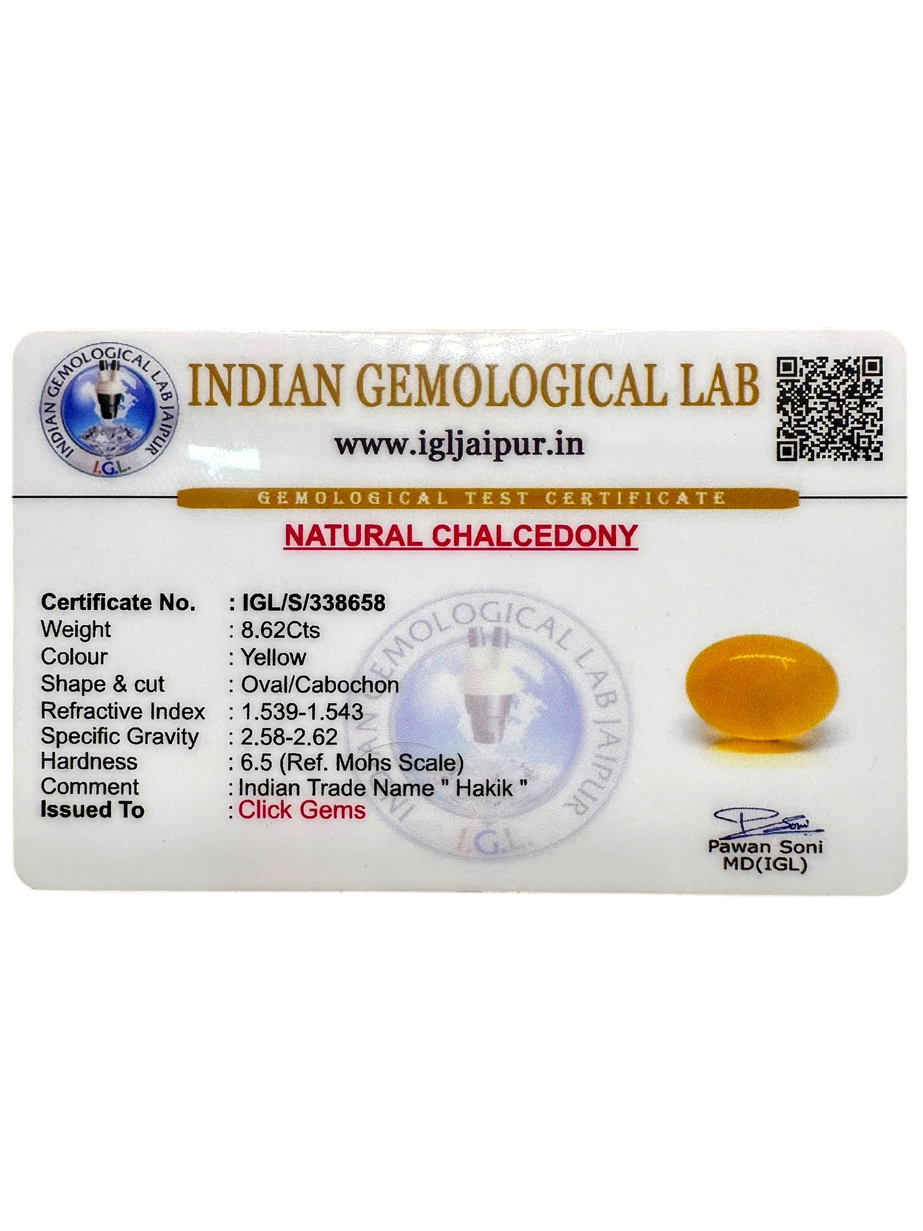 Discover the alluring beauty of this stunning 8.62-carat Natural Agate (Aqiq), also known as “Hakik” in Indian trade circles. Featuring a vibrant yellow color and a smooth oval/cabochon shape, this gemstone is a perfect blend of elegance and durability. With its semi-translucent appearance and unique patterning, this Agate exudes a subtle yet captivating charm, making it an excellent choice for any fine jewelry piece. Accompanied by an IGL lab certificate, this gemstone assures both authenticity and quality. Agate is known for its grounding energy, making it a popular choice for those seeking balance and protection in their lives.
