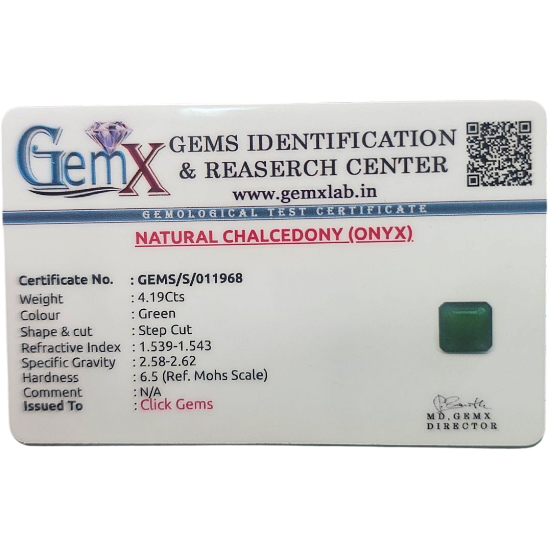 Unveil the power and elegance of this 4.19-carat Natural Aqiq (Onyx), a gemstone prized for its spiritual depth, clarity, and timeless beauty. Showcasing a rich green hue with a precisely crafted step-cut shape, this stone radiates sophistication, making it a standout piece for any jewelry collection.
