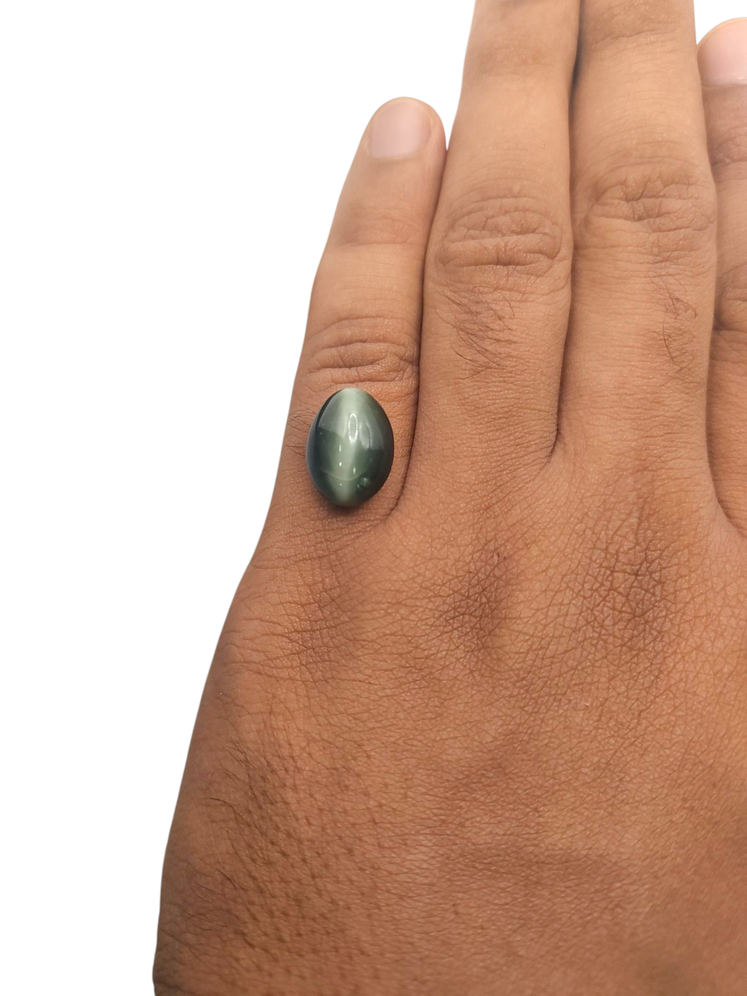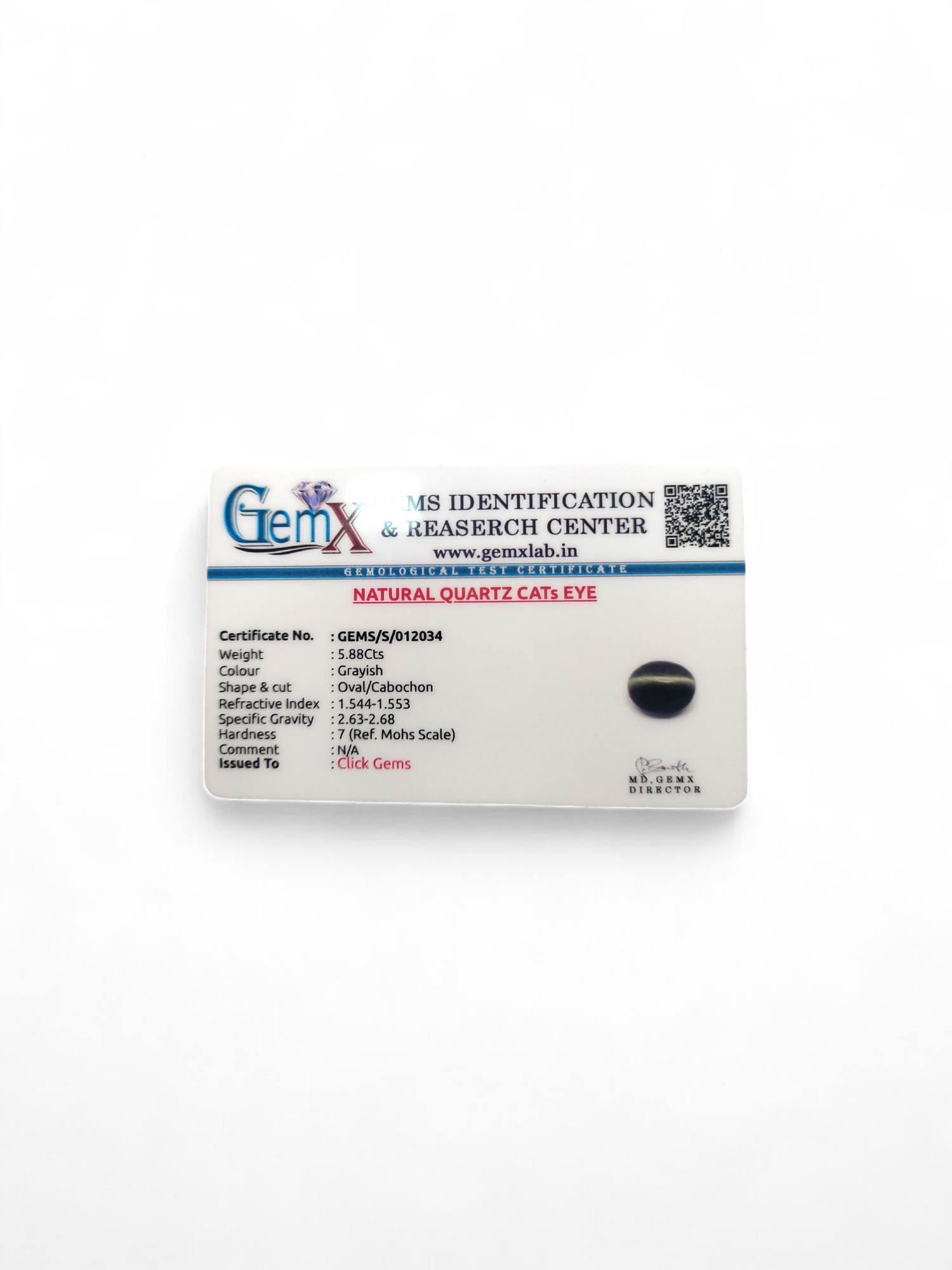 Unveil the mysterious charm of this 5.88-carat Natural Cat’s Eye Quartz, weighing 1.18 grams. With its grayish tone and finely polished oval cabochon cut, this gemstone showcases the captivating chatoyancy effect—a silky, glowing band that glides across the surface like a watchful eye.