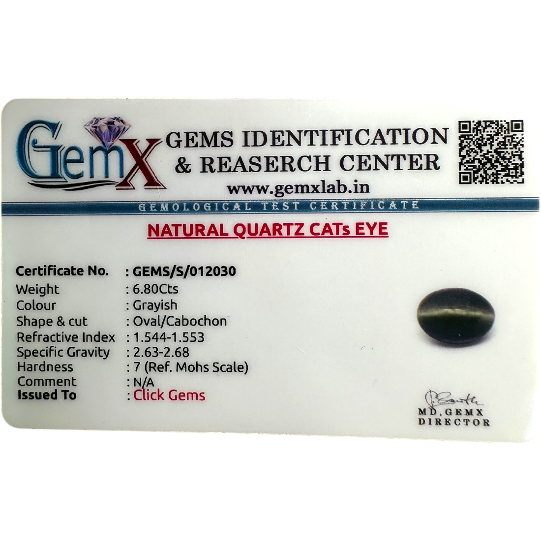 Discover the mystique of this 6.80-carat Natural Cat’s Eye Quartz, a gemstone known for its grayish hue and captivating chatoyancy (cat’s eye effect). The luminous band that glides across its surface gives it a unique and mesmerizing appearance. Cut into a smooth oval/cabochon shape, this gem beautifully enhances its natural optical phenomenon, making it a striking addition to any jewelry collection.