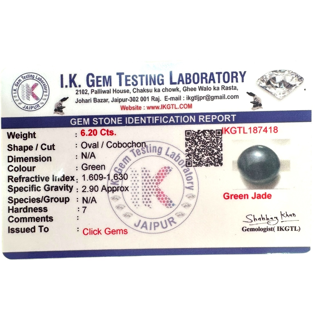 This captivating Green Jade gemstone weighs 6.20 carats and features a rich, soothing green color that exudes calmness and balance. The oval shape enhances its smooth surface and natural luster, bringing out the depth of its hue. With a hardness of 7 on the Mohs scale, this gemstone offers durability and resilience, making it an excellent choice for long-lasting jewelry pieces. Perfect for crafting rings, pendants, or earrings, this Green Jade gemstone adds a touch of tranquility and elegance to any collection.