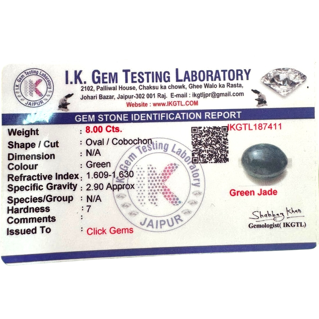 This stunning Green Jade gemstone weighs 8.00 carats and features a vibrant, rich green color that exudes elegance and tranquility. The oval shape enhances its natural beauty, with a smooth, polished surface that showcases the depth of its hue. With a hardness of 7 on the Mohs scale, this gemstone offers the perfect balance of durability and refinement, making it ideal for long-lasting fine jewelry. Perfect for creating rings, pendants, earrings, or other statement pieces, this Green Jade gemstone brings a sense of harmony, balance, and natural beauty to any collection.
