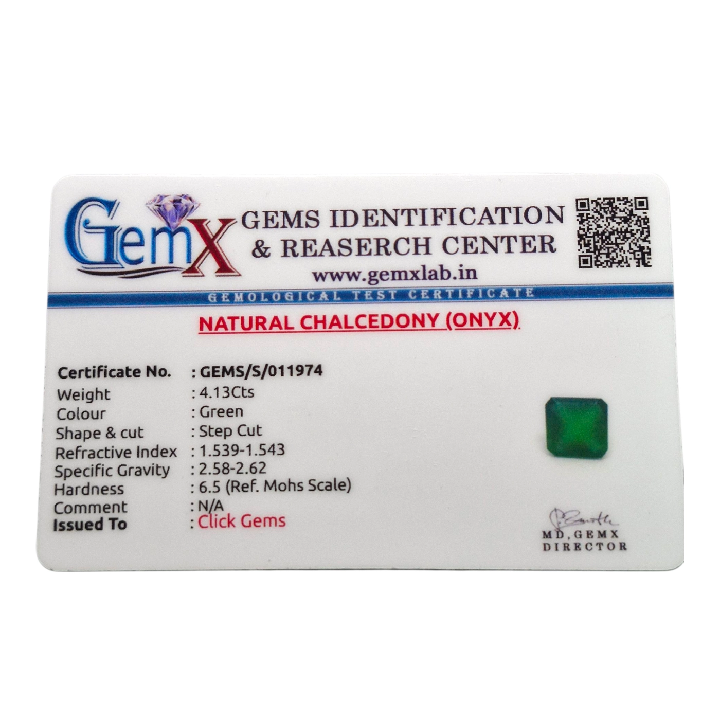Elegant green Natural Aqiq (Onyx), step cut and GEMX certified, perfect for calm and balance.