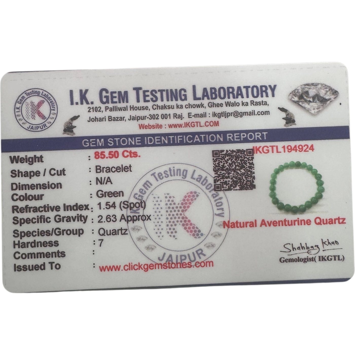 8 mm Aventurine Quartz beads bring good fortune and boost confidence. This bracelet is perfect for those seeking positivity and heart chakra healing. Includes lab-tested certificate of authenticity.