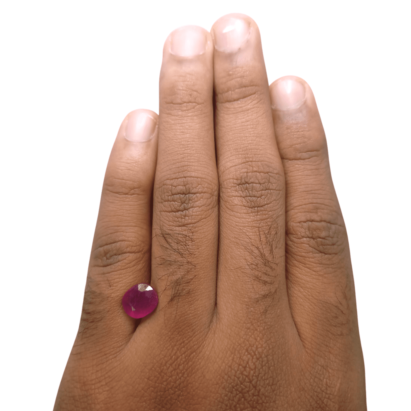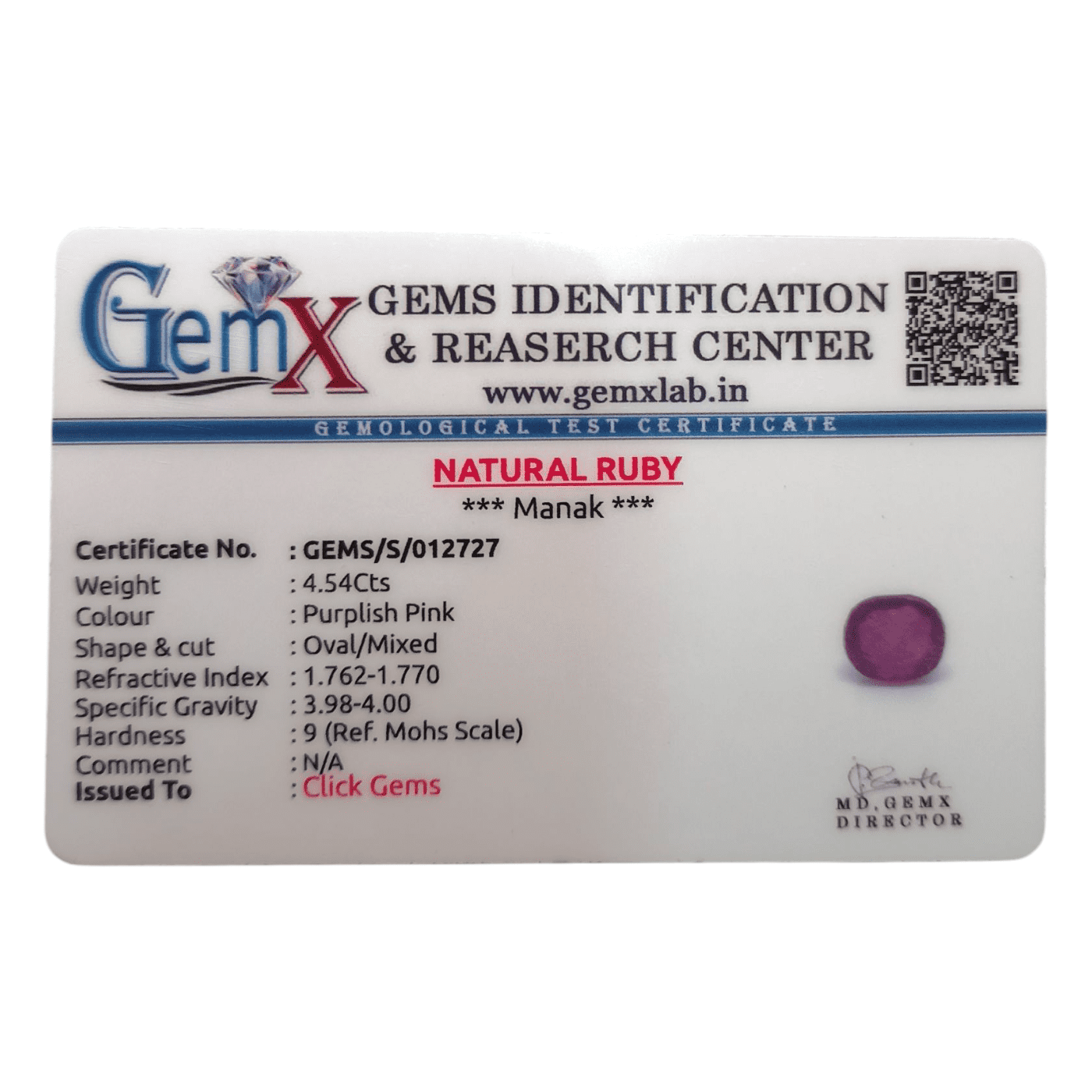 4.54 Carat Natural Ruby – Purplish Pink colour, oval / mixed shape. GEMX certified. Benefits: Enhances confidence, vitality, and leadership. Promotes love and emotional strength.