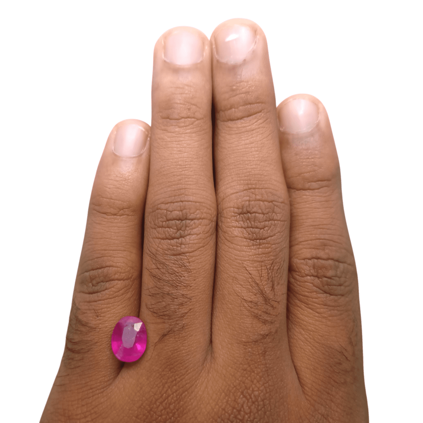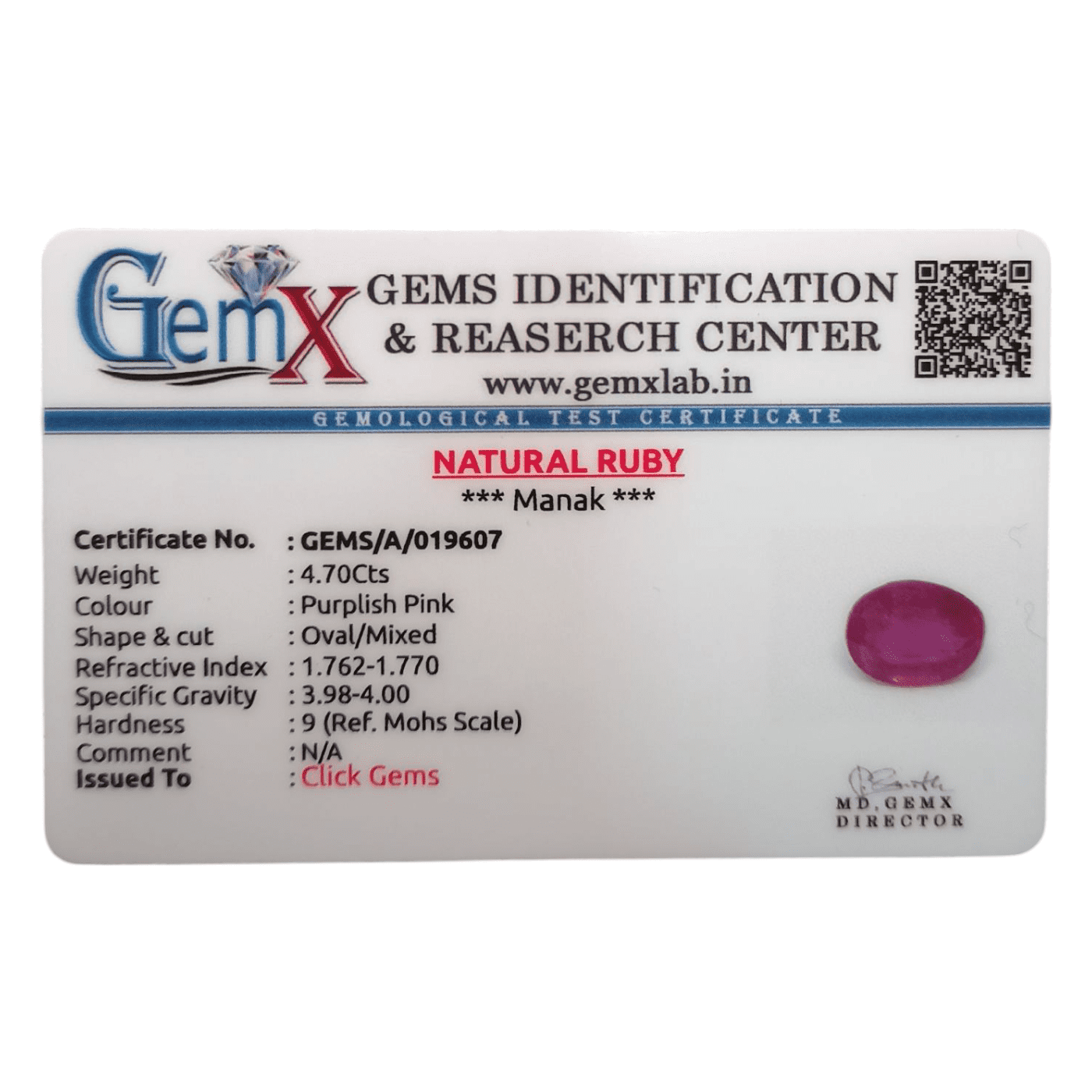 4.7 Carat Natural Ruby – Purplish Pink colour, oval / mixed shape. GEMX certified. Benefits: Enhances confidence, vitality, and leadership. Promotes love and emotional strength.