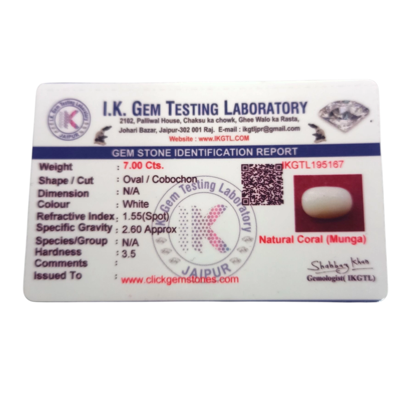 ✨ Natural White Coral (7.0 ct) – Premium quality, Oval Cabochon cut, radiating purity & elegance. Certified by IGL.