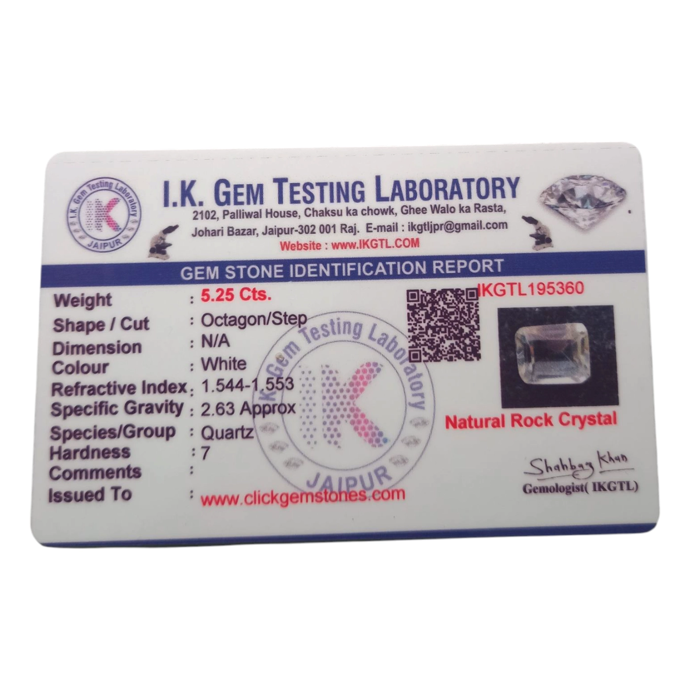 Elegant White Natural White Crystal 5.25 carat, Octagon/Step cut. Certified by IGL Certified.