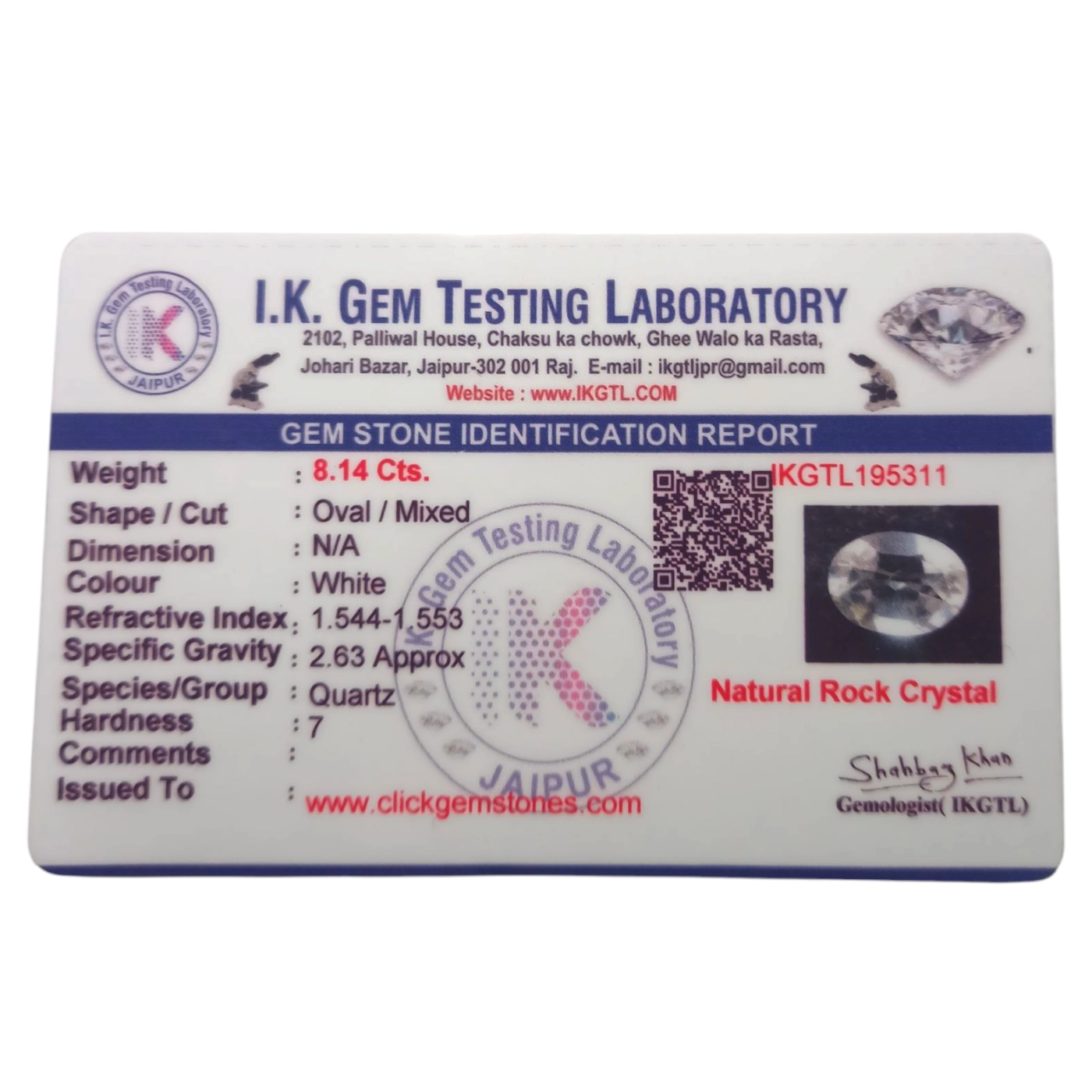 Elegant White Natural White Crystal 8.14 carat, Oval/Mixed cut. Certified by IGL Certified.
