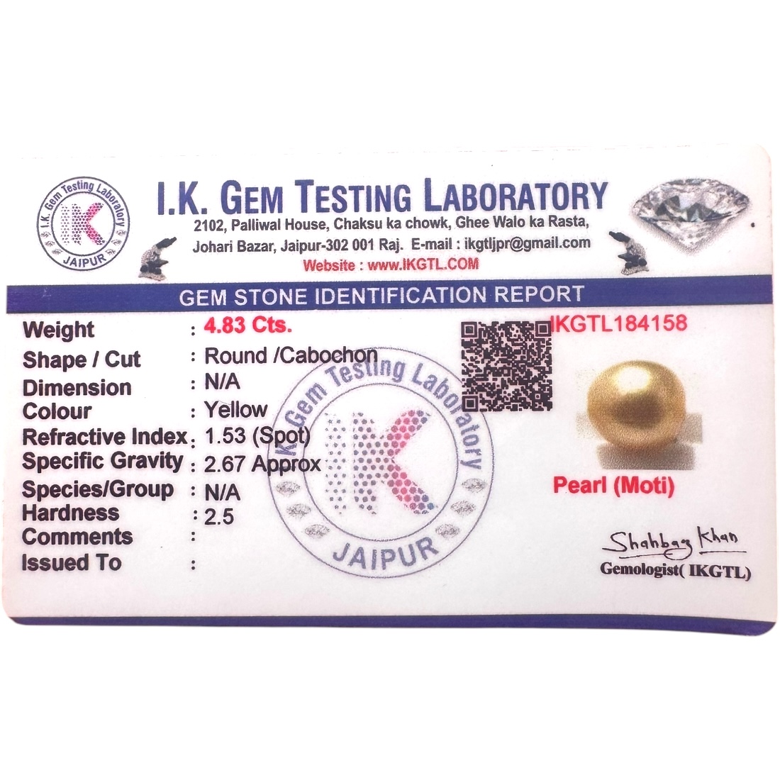 Embrace the radiant charm of this 4.83-carat Natural Yellow Pearl, a gemstone of purity, wisdom, and elegance. With its soft golden hue and smooth round cabochon shape, this luminous pearl exudes a luxurious glow, making it a timeless treasure for any jewelry lover.