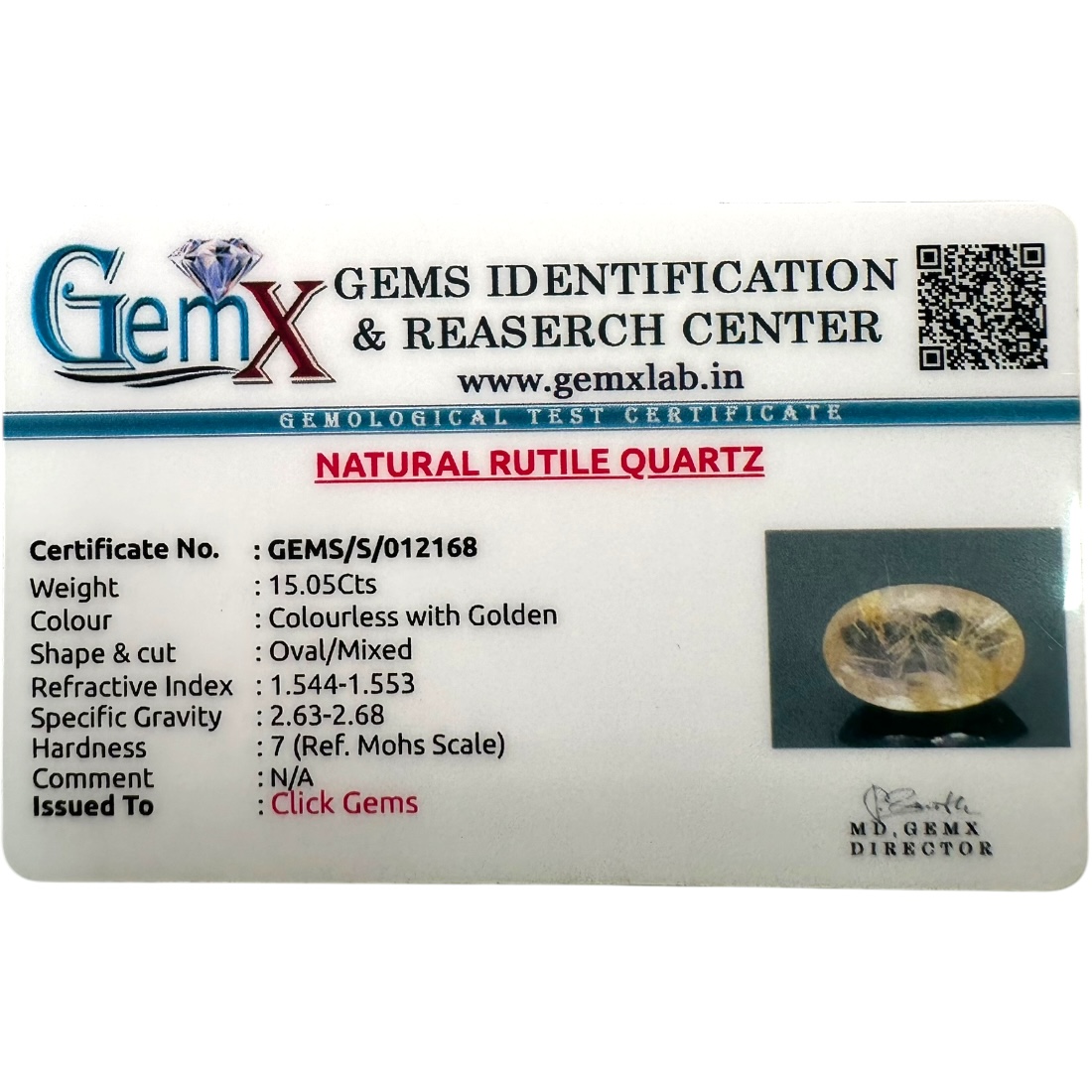 Experience the celestial elegance of this 15.05-carat Natural Rutile Quartz (Durr-e-Najaf), a gemstone of rare beauty and mystique. Featuring a colorless body adorned with golden rutile inclusions, this dazzling stone captures the essence of light and energy. Cut into a unique oval/mixed shape, it enhances both brilliance and natural charm, making it a striking addition to any jewelry piece.