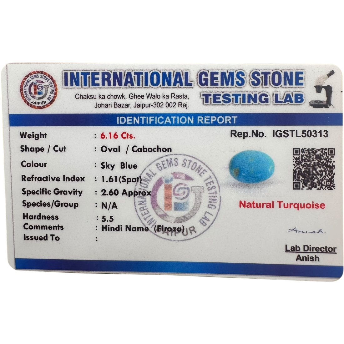 This elegant American Fairosa Turquoise gemstone, weighing 6.16 carats, features a stunning sky blue color that exudes calmness and clarity. The oval/cabochon shape enhances the natural beauty of the stone, highlighting its smooth, polished surface and rich hue. With a hardness of 5.5 on the Mohs scale, this turquoise is durable yet retains its soft and serene appearance, making it ideal for timeless jewelry pieces. Known for its healing properties and its ability to bring emotional balance, this turquoise gemstone adds both aesthetic appeal and spiritual significance to any design.