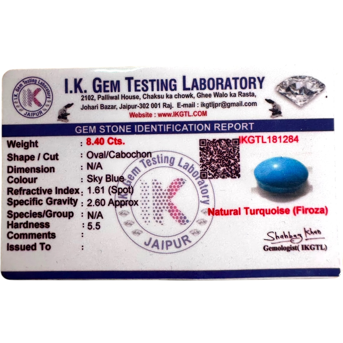 This beautiful American Fairosa Turquoise gemstone, weighing 8.40 carats, features a captivating sky blue color that evokes a sense of calm and tranquility. The oval shape enhances the stone’s smooth, polished surface, allowing its vibrant hue to shine brilliantly. With a hardness of 5.5 on the Mohs scale, this turquoise offers a wonderful combination of elegance and durability, making it ideal for crafting stunning and meaningful jewelry. Known for its protective and healing properties, turquoise is believed to bring emotional balance and positive energy, making it a perfect addition to any special jewelry design.