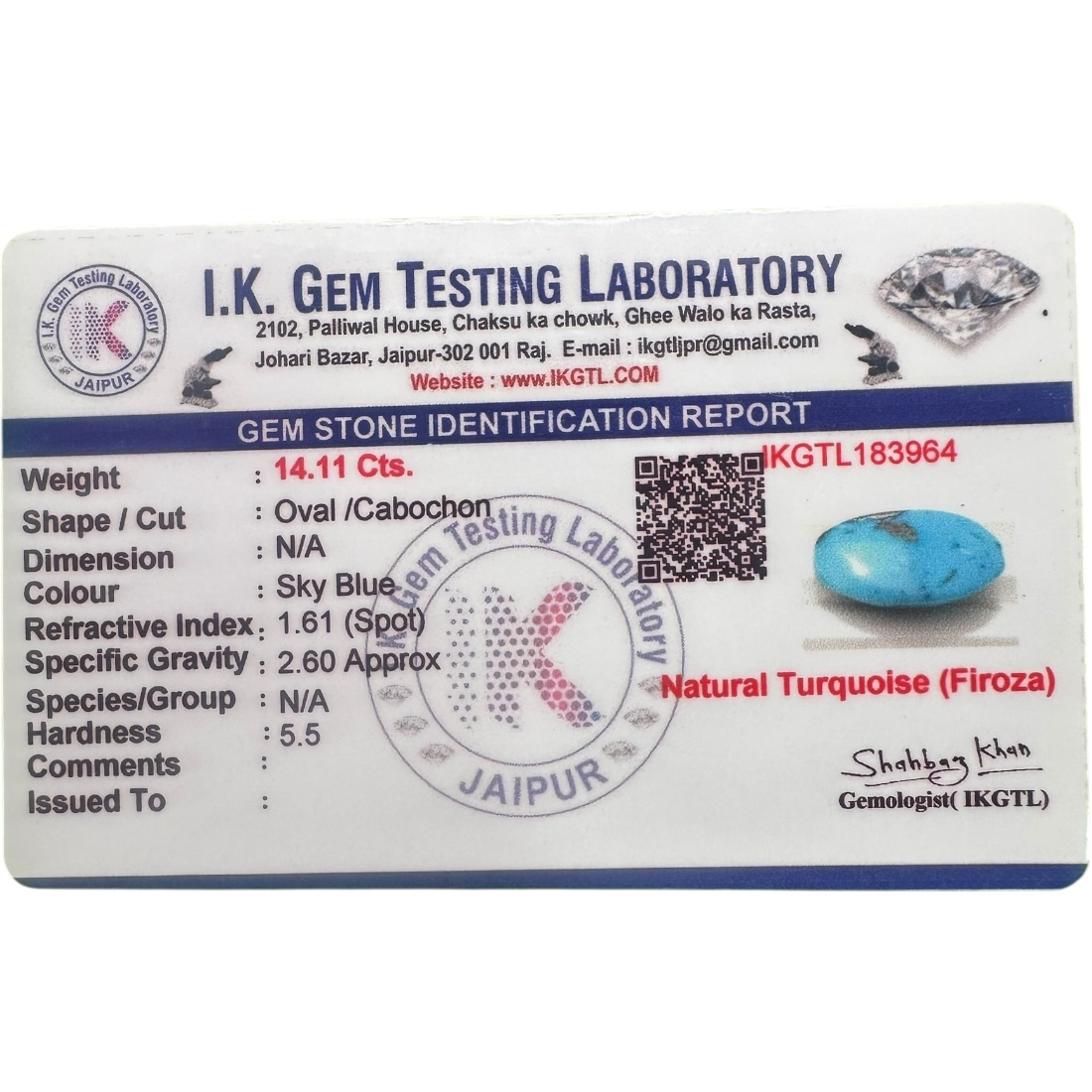 This exquisite Iranian Fairoza Turquoise weighs 14.11 carats and boasts a beautiful sky-blue color, radiating natural elegance and serenity. Sourced from the world-renowned turquoise mines of Iran, this authentic gemstone is celebrated for its rich hue and exceptional quality. With a Mohs hardness of 5.5, it offers an ideal balance of durability and beauty, making it perfect for creating luxurious, custom jewelry pieces. Symbolizing wisdom, protection, and positive energy, this turquoise gemstone is an ideal choice for crafting statement rings, pendants, and bespoke jewelry designs that combine elegance with meaningful symbolism.