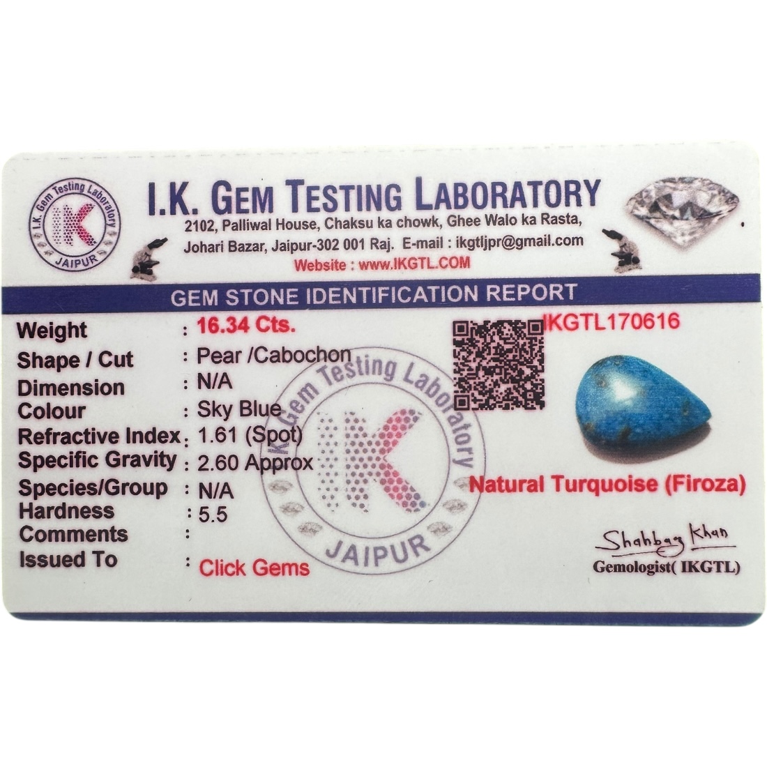 This stunning Iranian Fairoza Turquoise weighs 16.34 carats and features an elegant pear shape that beautifully accentuates its mesmerizing sky-blue hue. Sourced from the renowned turquoise mines of Iran, this authentic gemstone is celebrated for its vibrant color and exceptional quality. With a Mohs hardness of 5.5, it offers the perfect combination of durability and beauty, making it ideal for crafting luxurious, custom jewelry pieces. Symbolizing wisdom, protection, and positive energy, this turquoise gemstone is a perfect choice for creating bespoke rings, pendants, or other timeless jewelry designs that exude sophistication and meaningful symbolism.