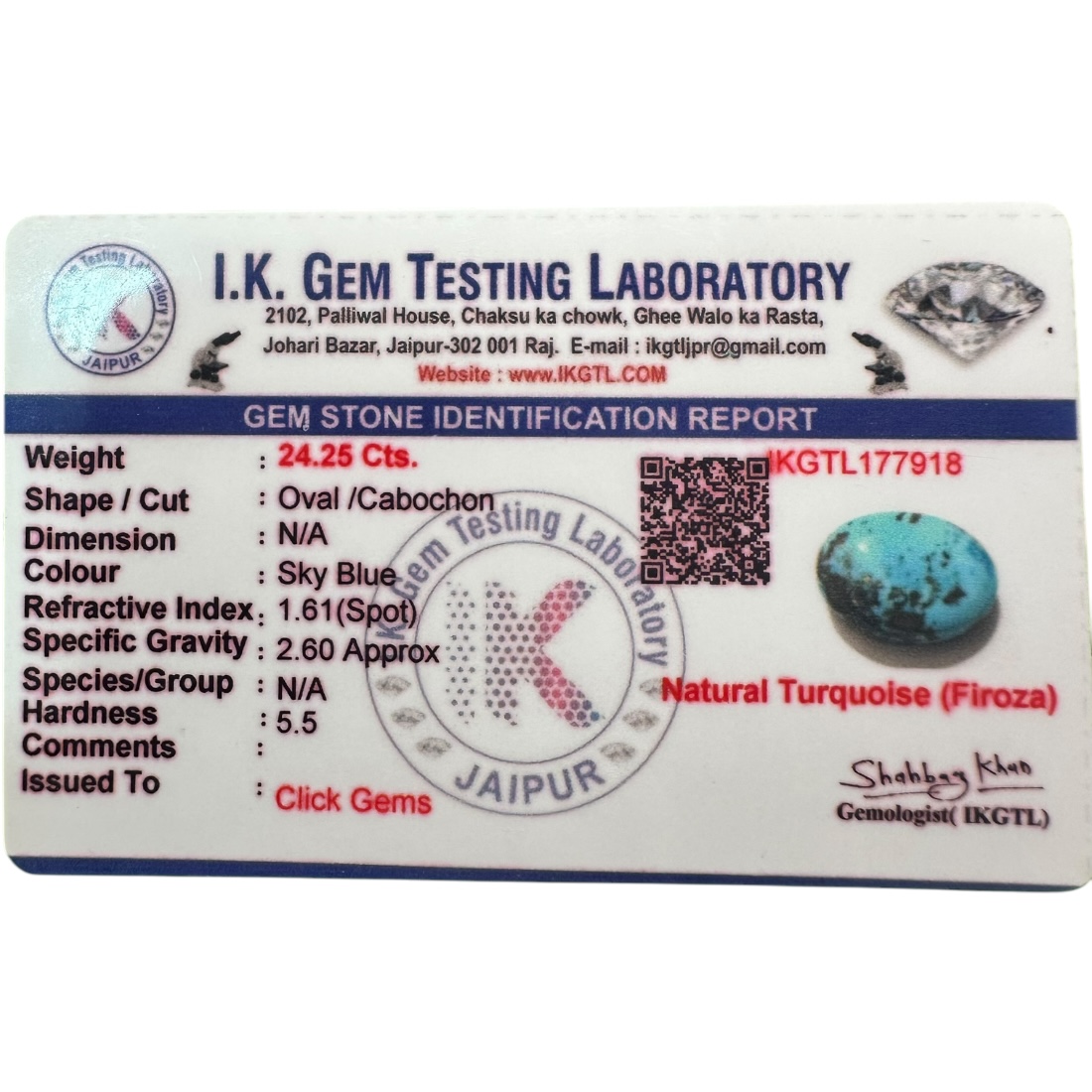 This remarkable Iranian Fairoza Turquoise weighs 24.25 carats and features an elegant oval shape, showcasing its stunning sky-blue hue. Sourced from the world-renowned turquoise mines of Iran, this authentic gemstone is celebrated for its superior quality and vibrant color. With a Mohs hardness of 5.5, this gemstone offers both durability and beauty, making it ideal for crafting timeless jewelry pieces. Symbolizing wisdom, protection, and positive energy, this turquoise is perfect for creating luxurious rings, pendants, or bespoke designs that exude sophistication and meaning.