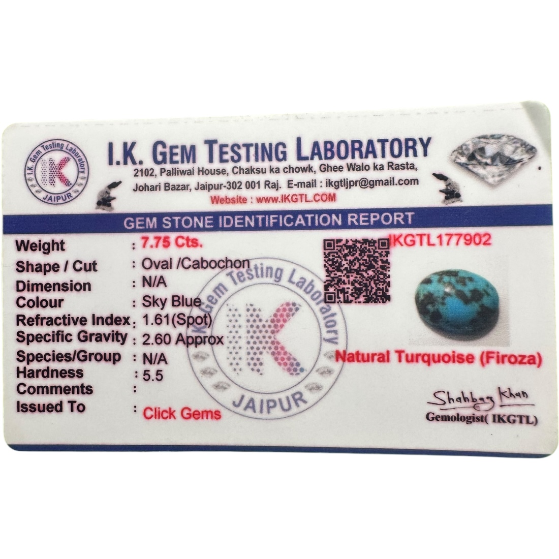 This exquisite Iranian Fairoza Turquoise weighs 7.75 carats, showcasing a vibrant sky-blue color that exudes elegance and timeless beauty. Known for its exceptional quality, this authentic gemstone hails from the prestigious turquoise mines of Iran, celebrated for producing some of the finest turquoise in the world. The smooth oval shape enhances its natural beauty, while the 5.5 Mohs hardness ensures both durability and charm. With its symbolism of wisdom, protection, and positive energy, this turquoise is a perfect choice for creating luxurious jewelry pieces such as rings, pendants, and custom designs.