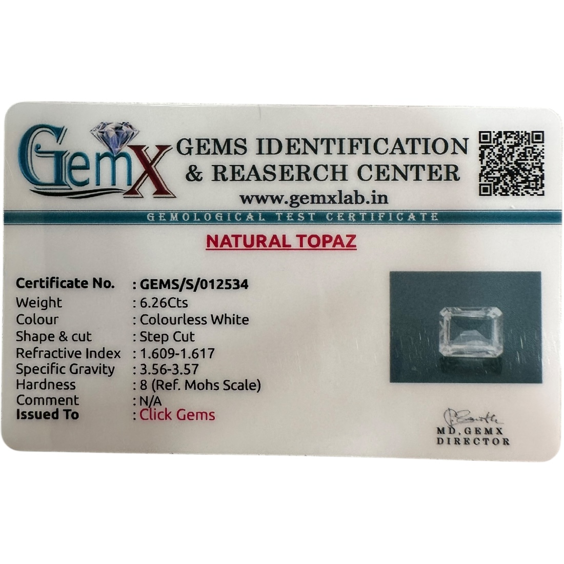 This White Topaz gemstone, weighing 6.26 carats, combines classic elegance with modern sophistication. Its colorless white hue offers a pure, radiant brilliance that catches the light beautifully. The step cut shape enhances its clarity, allowing the gemstone to reflect light in a geometric and striking manner. With a hardness of 8 on the Mohs scale, this gemstone is durable, making it perfect for rings, pendants, or custom jewelry that is designed to last. Add a touch of timeless elegance and sparkle to your collection with this exceptional White Topaz gemstone!